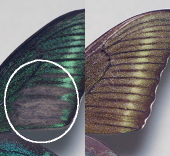♀は10cm〜で、春・夏型共に、♀がやや大きい。 北海道産・本州産:夏型♂の比較で、明確な差異は認められない。 ♂と♀:翅の地色は、春型・夏型いずれも♂が黒っぽく、♀は赤茶っぽい印象がある。胴体の太さは明らかに♀が太く、前翅外縁のくびれは♂の方が強く♀は直線的な印象がある。表面 の金緑色の鱗粉の発達は♂が強くコントラストがあるが、♀ではややぼやけた印象。♂の前翅表面 下部には、性標が明瞭に見える。(左写真、左が♂右が♀の前翅、♂の写真、白丸内の翅脈に沿って黒い毛が生えている) この特徴は、近似種カラスアゲハにも、共通で見られる。 |