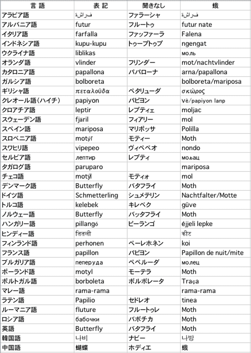 また、第3話にも書きましたが、日本ではかつて蝶と蛾の区別 はなく、明治以降にイギリスから“moth”という単語が入ってきて、対訳が見つからずにお隣の中国から“蛾”という言葉を拝借した訳ですが、同様に独自の国の言葉で蝶を意味する単語が存在しても蛾を意味する言葉が無く“moth”をそのまま受け入れてしまった国と“夜”を意味する単語とくっつけて蛾を意味するようになった国が多いことも実感します。