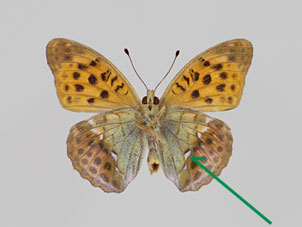 しかしながらオスは、表面がミドリヒョウモンのオスと類似している。 区別点は…前翅中室の黒条線(赤○)がミドリヒョウモンではそれぞれが独立し前翅の縁に対し概ね直角であるのに対し、メスグロヒョウモンでは内側の2個が融合しかかっており、また外側の1個は前翅の縁に対し斜めに配されている。また、ミドリヒョウモンでは後翅中室端に黒色条(白丸)が有るのに対し、メスグロヒョウモンではこれを欠く…などで識別 できる。 |