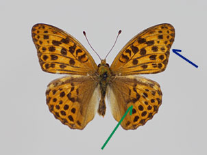 名前が示す通り、一般的にウラギンスジヒョウモンよりオオウラギンスジヒョウモンの方が大型である。前翅外縁はウラギンスジヒョウモンでは概ね直線的であるが、オオウラギンスジヒョウモンでは窪みがある。(青矢印)。後翅表面 中央の黒色条(緑矢印)は、ウラギンスジヒョウモンでは支脈で分断される傾向が強いが、オオウラギンスジヒョウモンでは連続性が強い。前翅裏面 の先端(赤丸)は、オオウラギンスジヒョウモンでは暗褐色である。など、総合的に判断する必要がある。 |
