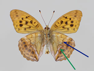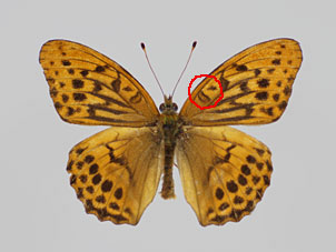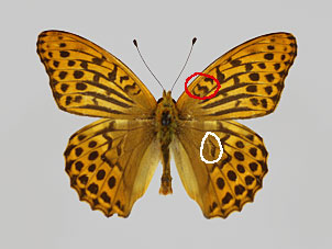 しかしながらオスは、表面がミドリヒョウモンのオスと類似している。 区別点は…前翅中室の黒条線(赤○)がミドリヒョウモンではそれぞれが独立し前翅の縁に対し概ね直角であるのに対し、メスグロヒョウモンでは内側の2個が融合しかかっており、また外側の1個は前翅の縁に対し斜めに配されている。また、ミドリヒョウモンでは後翅中室端に黒色条(白丸)が有るのに対し、メスグロヒョウモンではこれを欠く…などで識別 できる。 |