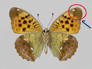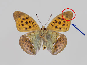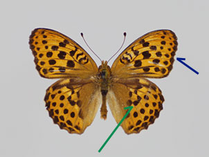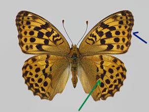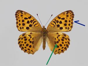 名前が示す通り、一般的にウラギンスジヒョウモンよりオオウラギンスジヒョウモンの方が大型である。前翅外縁はウラギンスジヒョウモンでは概ね直線的であるが、オオウラギンスジヒョウモンでは窪みがある。(青矢印)。後翅表面 中央の黒色条(緑矢印)は、ウラギンスジヒョウモンでは支脈で分断される傾向が強いが、オオウラギンスジヒョウモンでは連続性が強い。前翅裏面 の先端(赤丸)は、オオウラギンスジヒョウモンでは暗褐色である。など、総合的に判断する必要がある。 |